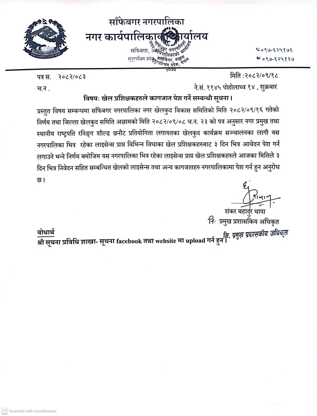 » खेल प्रशिक्षकहरुले। कागजात पेश गर्ने सम्बन्धी सूचना ।