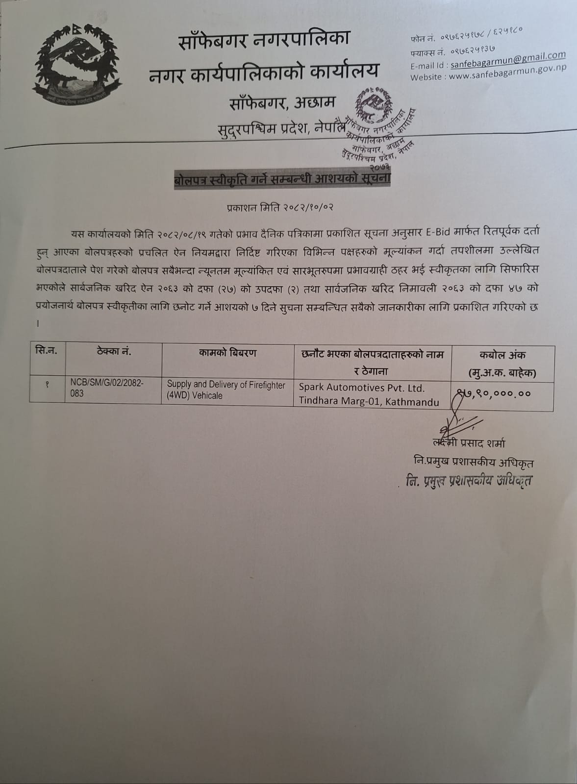 » बोलपत्र स्वीकृति गर्ने सम्बन्धी आशयको सूचना ।