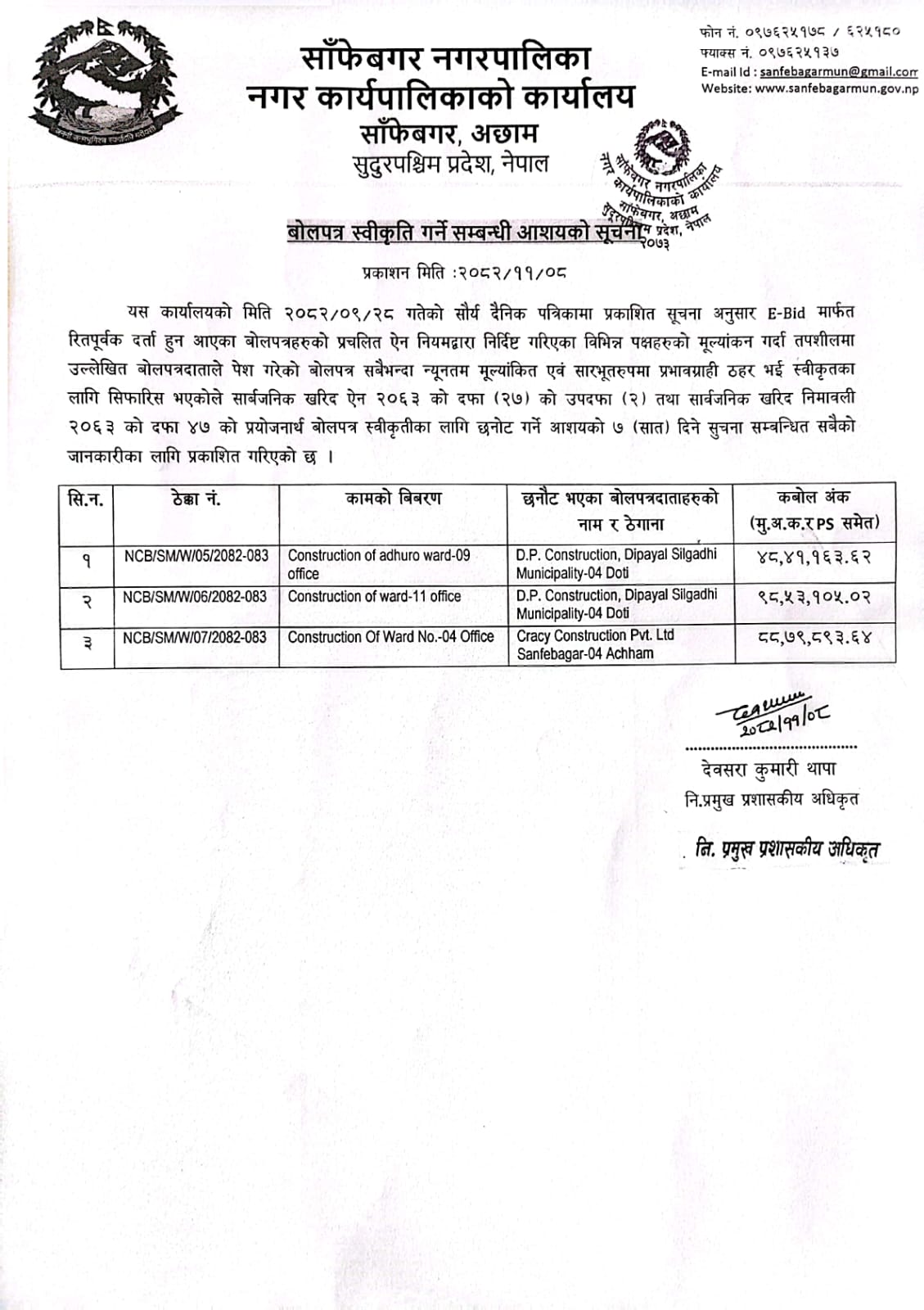 बोलपत्र स्वीकृति गर्ने सम्बन्धी आशयको सूचना ।