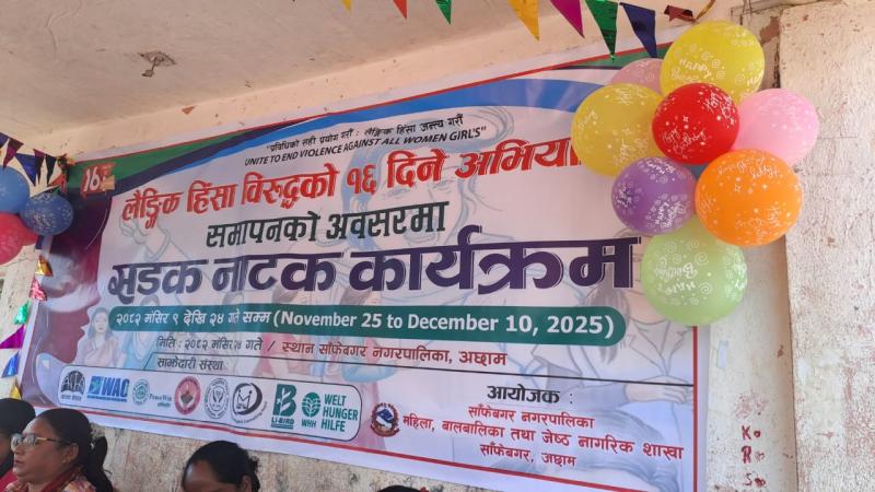 लैङ्गिक हिंसा विरुद्धको १६ दिने अभियानको समापनमा साँफेबगर नगरपालिकाद्धारा आयोजित वडास्तरिय सडक नाटक प्रतियोगिता आयोजना गरी उक्त अभियान सफलतापूर्वक समापन गरिएको छ। । मिति ः- २०८२/०८/२४ गते ।